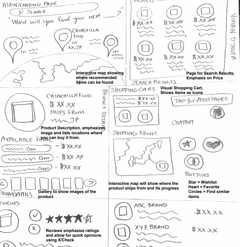 Sketches of app solutions including the landing page, search, shopping cart, product details, and pricelist for a Japanese Imports app.